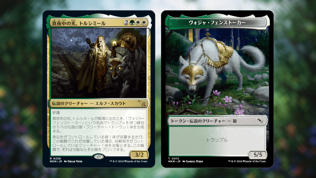 狼の友、トルシミールが戦場に出たとき、《エルフの友、ヴォジャ/Voja, Friend to Elves》という名前の緑であり白である3/3の伝説の狼(Wolf)クリーチャー・トークンを1体生成する。