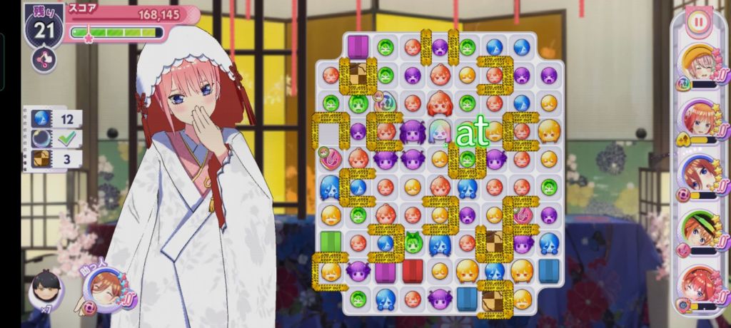 クリア条件は、12手以内、13チェイン、泡玉全て消す、さくら玉全て消す。
