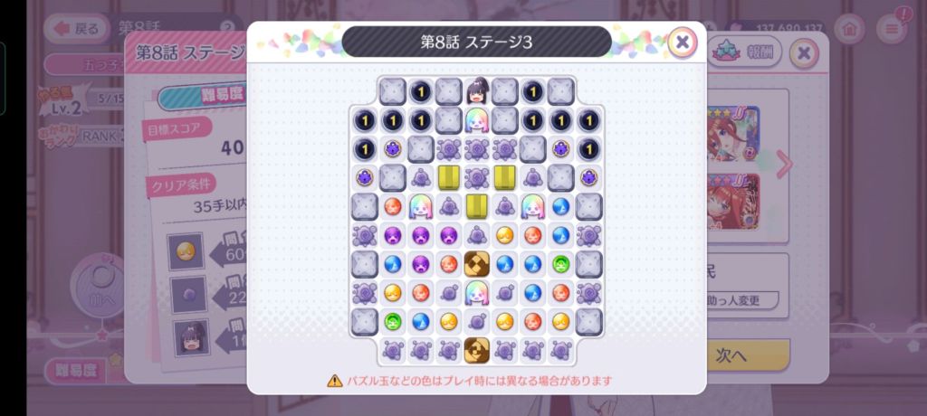 クリア条件は、35手以内、黄色60個消す、ホコリ22個消す、らいは玉1個落とす。