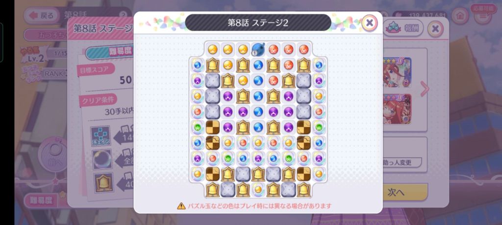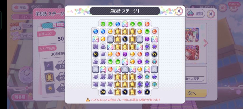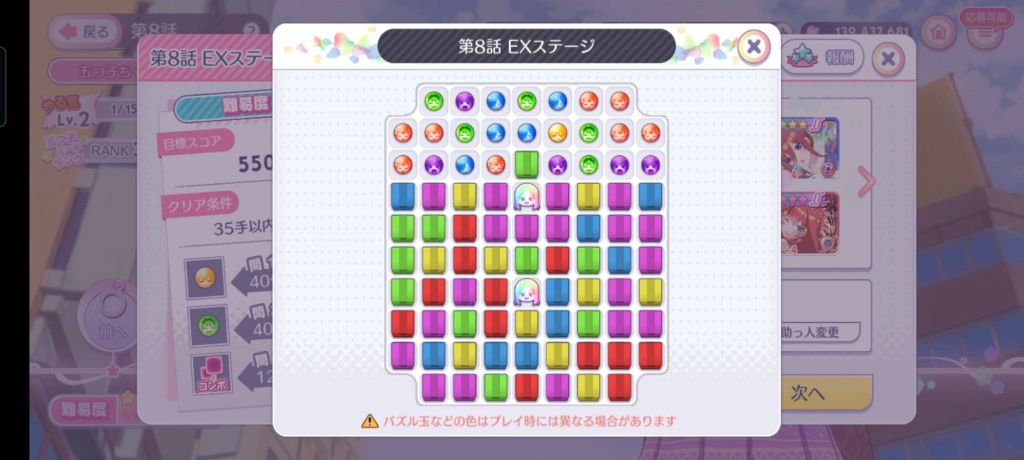クリア条件は35手以内、黄色40個消す、緑40個消す、12コンボ。