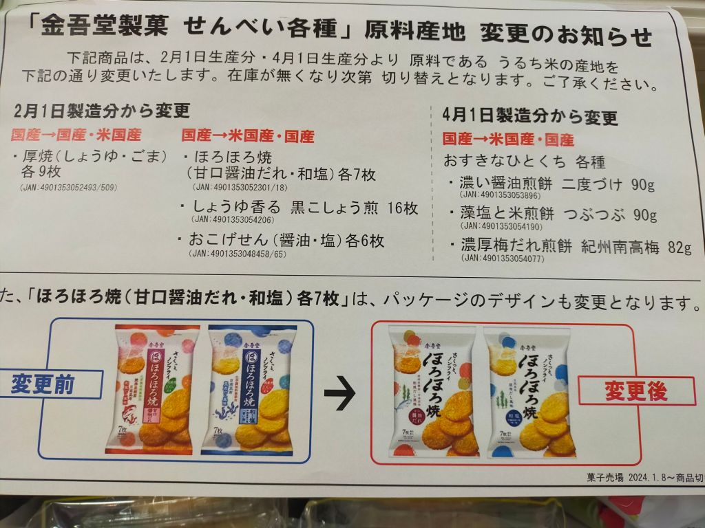 せんべいの原料産地とパッケージが変わるというお知らせ。