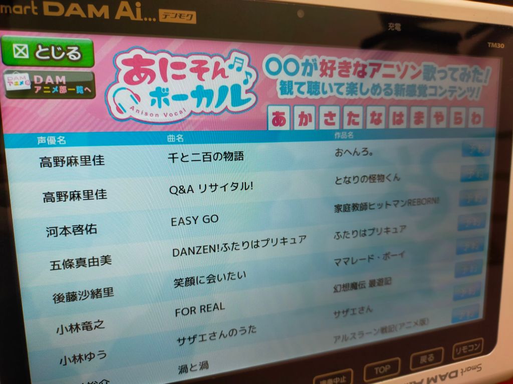 一人カラオケの機種はDAMを選んだのだが、あにそんボーカル(声優さんが歌っているやつ)の本人映像が見られなかった。