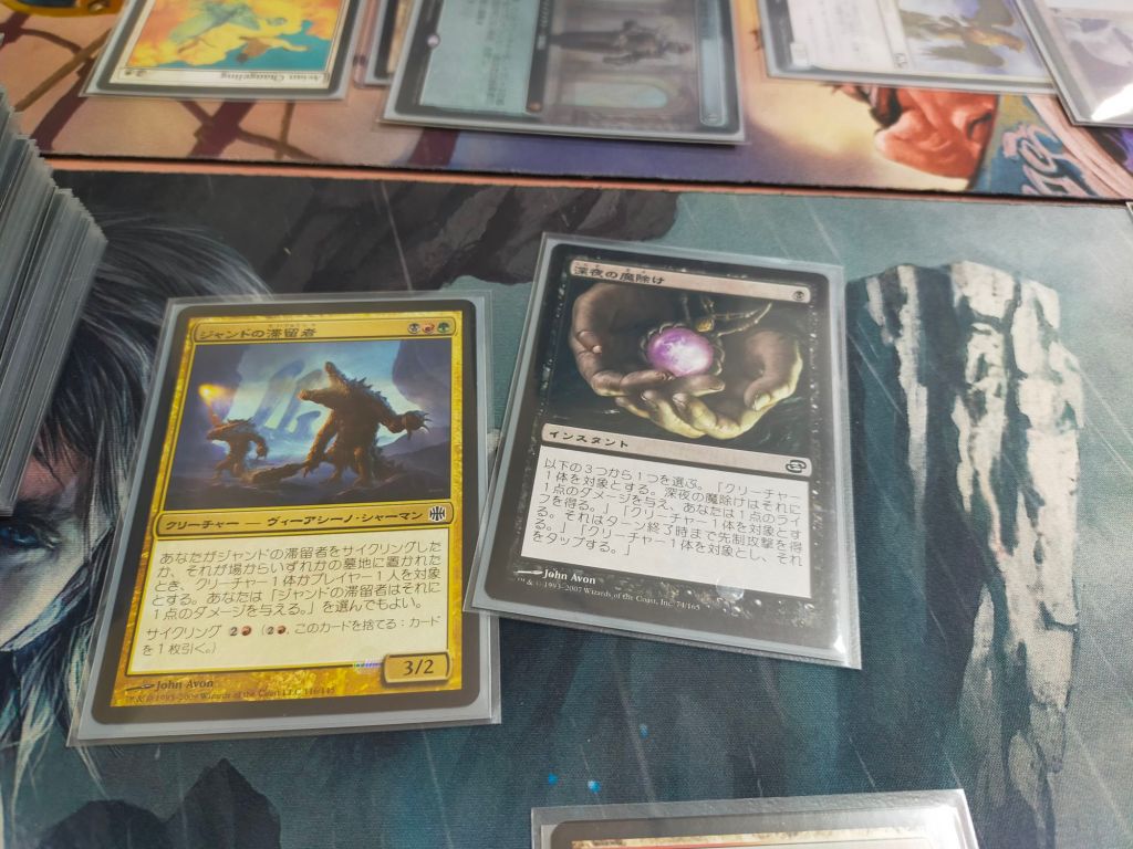 マナを使い切ったタイミングで、鏡の精体を除去しようとしたが、ズーベリーにより2/2になっていたため「ジャンドの滞留者」と「深夜の魔除け」の2枚を使って2点ダメージで除去。
