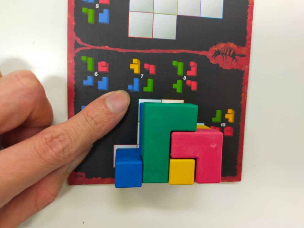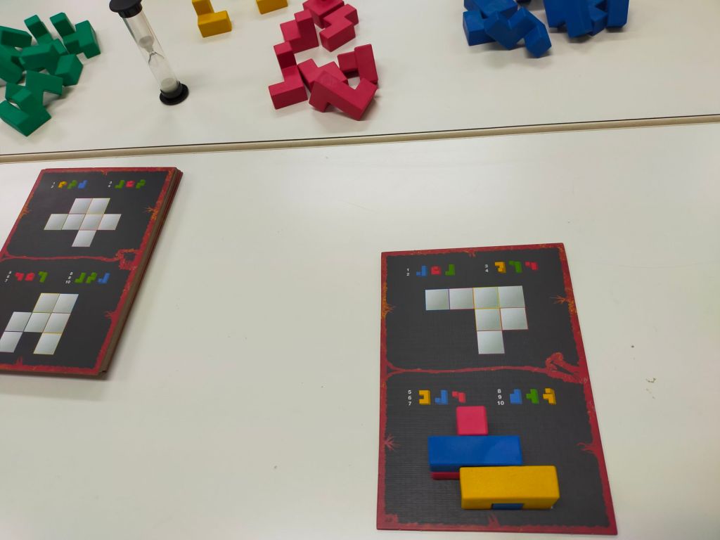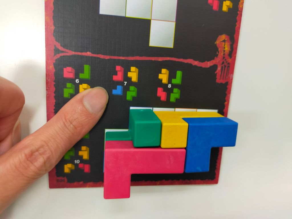 お題のボードは、両面使えるようになっており、ブロックを3つ使う簡単なモードと、ブロックを4つ使う難しいモードがある。