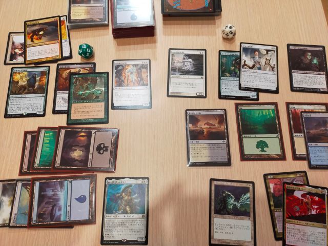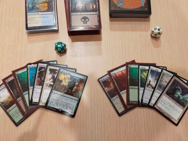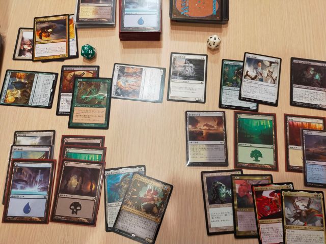 土地デッキを2つにして、「アンタップインで出る1色土地」でテンポを優先するか、「タップインで出る2色土地」で色を揃えるか、を選べるようにした。