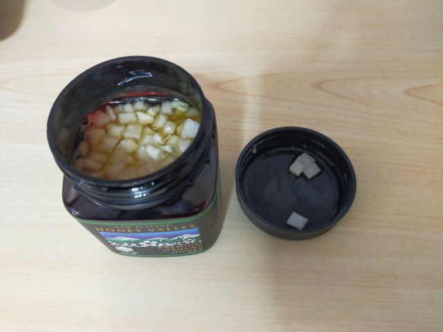 マヌカハニーの残りが少なかったので、その容器に角切りの大根を満タンに入れる。