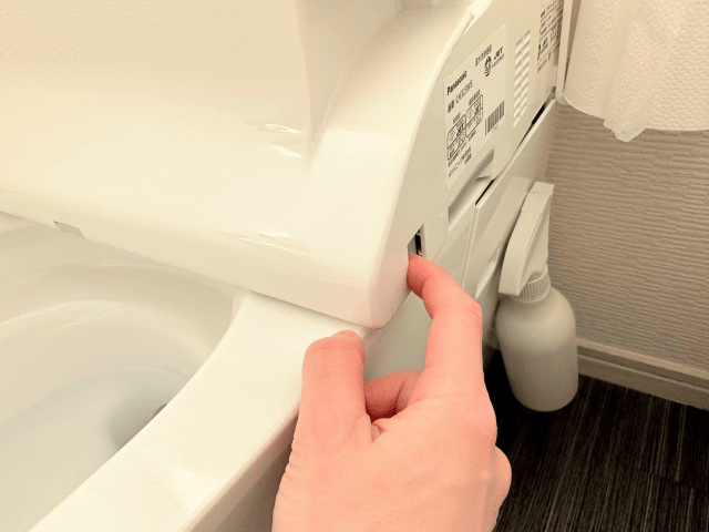 ウォシュレット付きのトイレは向かって右側(座っている時は左側)にあるスイッチを押すと、便座ごと手前にスライドできる。
