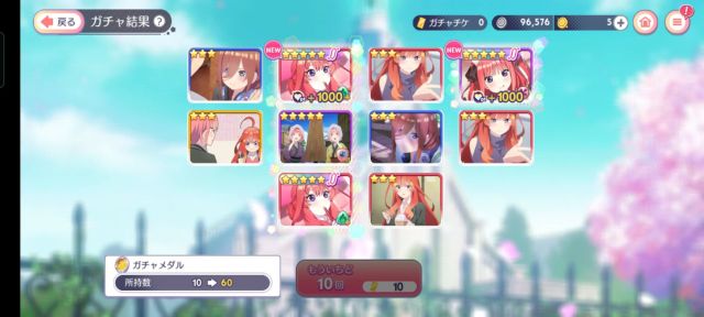 報酬で30回、順位報酬で20回ガチャを回せるし、コイン555枚で確定チケットが得られるので、久しぶりに5人全員揃うかも知れない。