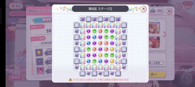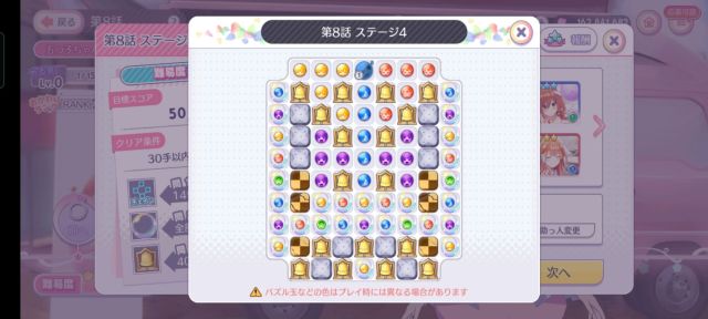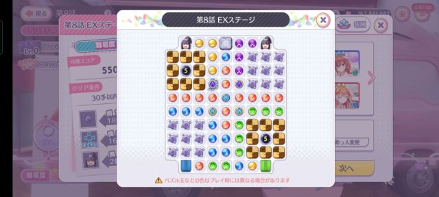 私は「125(一花、二乃、五月)の色変換ループ編成」で行ったのだが、「色変換スキル玉」が大量に出てしまいとても邪魔だった。
