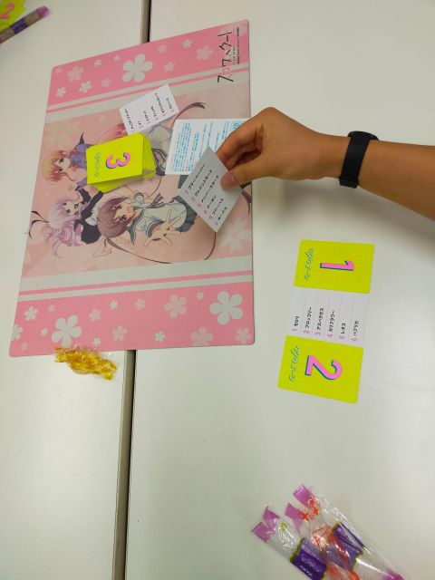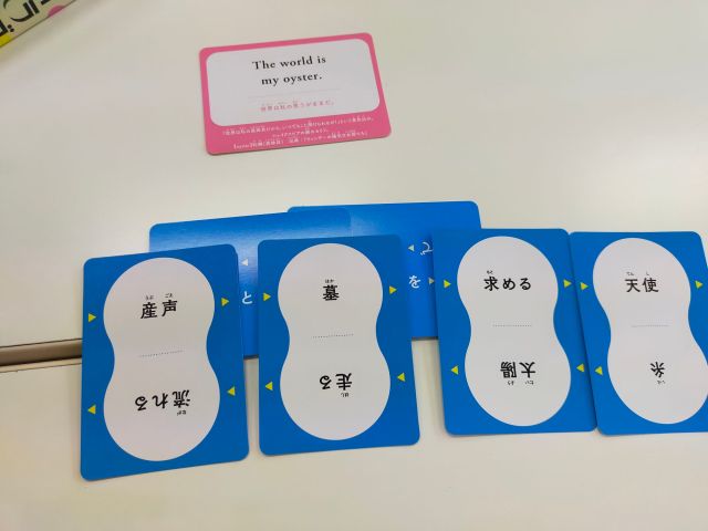 子に配られたカード(青色)は片面に2つの単語、その裏面に助詞「が、と、を、の」などが書かれている。