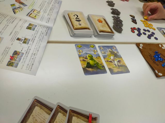 山札は2つあり、左は数字と得られる報酬、右はドラゴンの色が書かれている(2つ合わせて本のようになっている)。