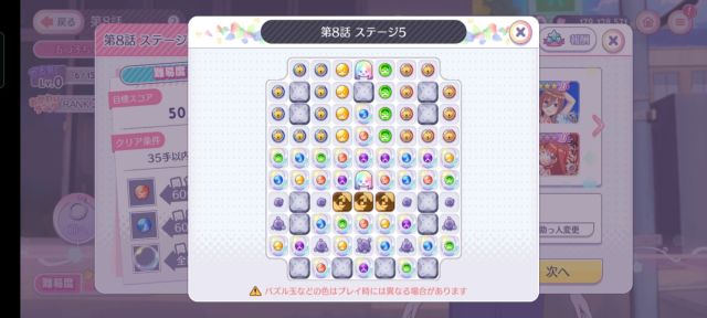 泡、色箱、クッキー、メタルブロックとギミックが多いが、助っ人スキルにメタル破壊LV5(4個破壊できる)があると、範囲破壊が使えるので楽。