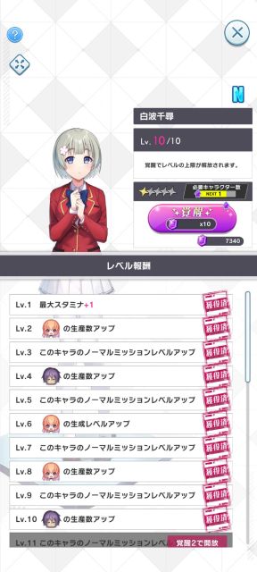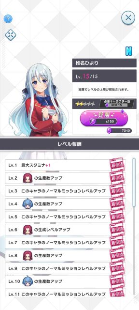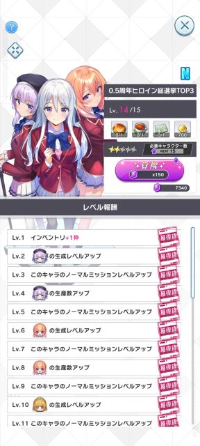 あとは、女性キャラのレベルアップ、生産量アップ、ミッションレベルアップ。