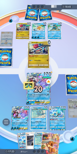 この後、リーフを引いてパルキアを逃がし、3エネ付いたパルキアを出して、シャワーズで水エネを移動しディメンションストーム・・・の前に相手が降参した。