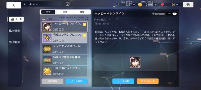 秘書艦の左に設定しておいたので、バレンタインチョコを貰えた。
