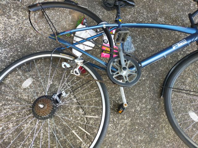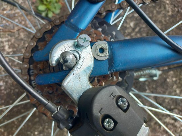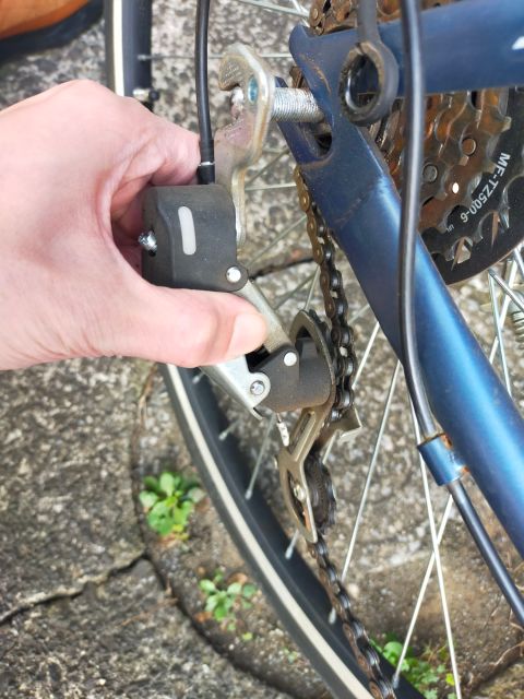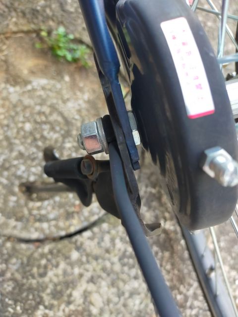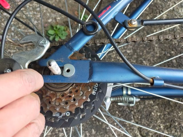 後で気づいたが、右側にあるコの字型の金具は、自転車が転倒したときに軸を守るためにあるんだな。