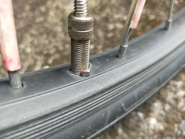 前輪にも空気を入れておこうと思ったらナットが割れていた。