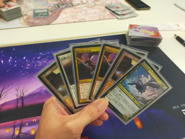 1戦目は、相手ターンに暴力的な突発を2回唱えて(1回目の超起源は打ち消された)超起源が通った時点で相手が投了した。