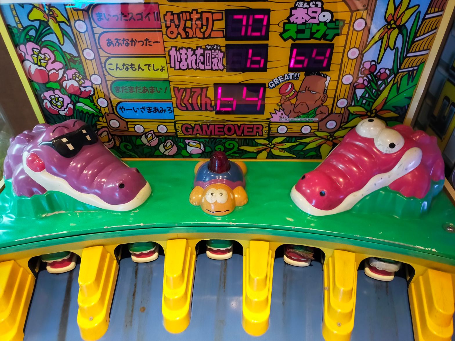 ちょっとだけ顔を出してすぐ引っ込むワニが居たり、5匹同時に出てきたり、叩くのが間に合わないなど結構忙しい。楽しい。