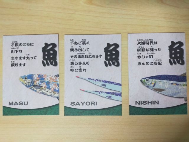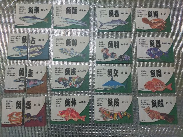 左の魚偏カードが読み札になっているので「かるた」として遊べる。