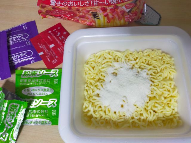 過去に麺だけ使ったため、粉末ソース、いちごソース、あとのせかやく、は2個分ある。