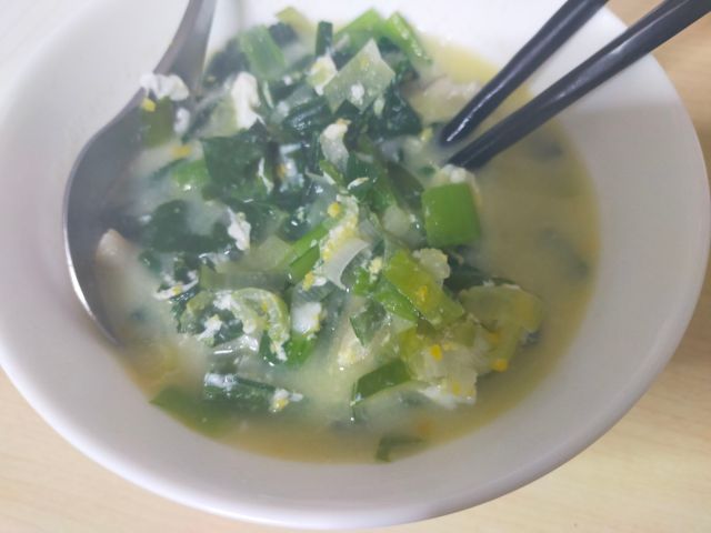 長ネギ1本、ニラ1束、小松菜2束、卵4個、しめじ1袋、コンソメを入れてスープを作る。