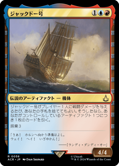 ジャックドー号がプレイヤー1人に戦闘ダメージを与えるたび、あなたの手札を捨ててもよい。そうしたなら、あなたがコントロールしているアーティファクト1つにつき1枚のカードを引く。