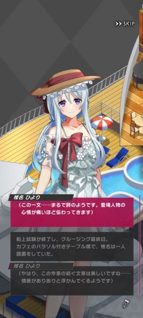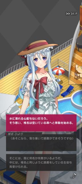 水着姿ではあるものの、パラソル付きテーブル席で読書に興じる椎名ひより。