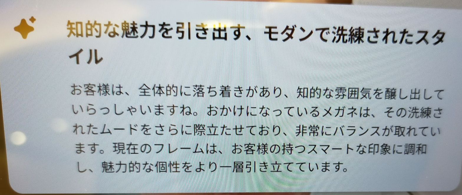 今のメガネはJINSで「男性型AIから86%、女性型AIから78%のマッチ度と判定されたメガネ」なので、高評価なのも納得。