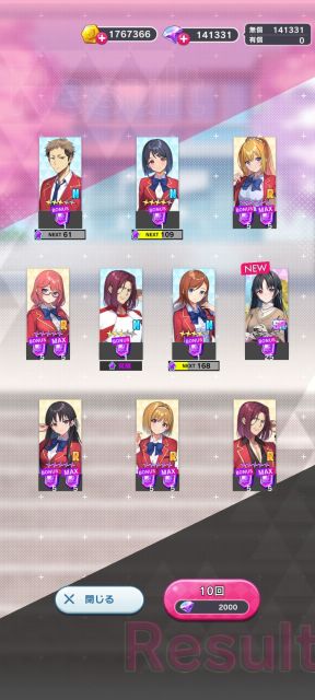 10回ガチャのみでダイヤ消費は2,000で済んだ。