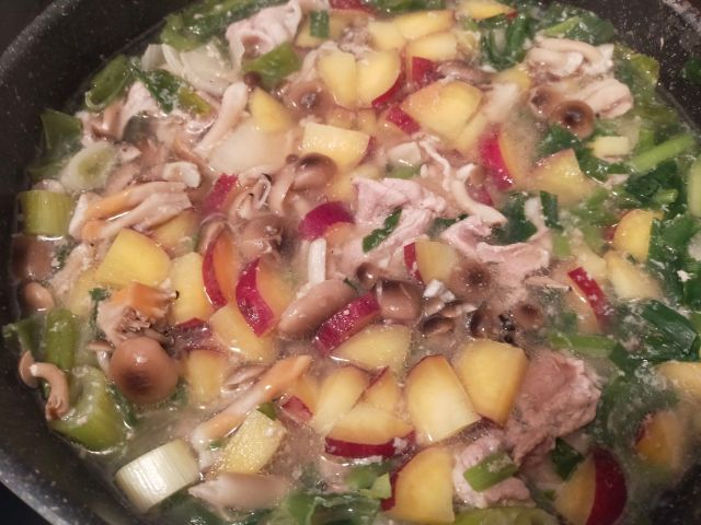 蕎麦湯、豆乳、コンソメ、豚バラ肉、サツマイモ、小松菜、長ネギ、玉ねぎ、ニラ、しめじ、を入れて煮込む。