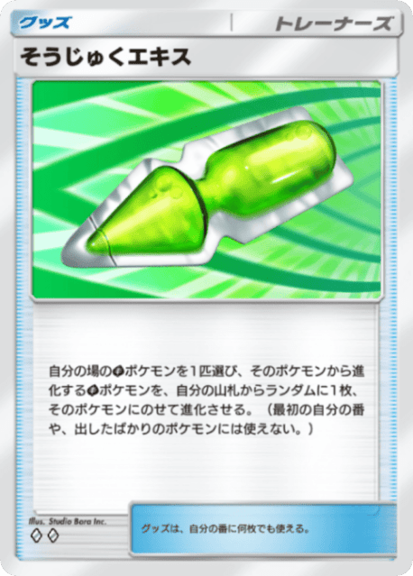 1進化で1エネ30ダメージ、トラッシュに「そうじゅくエキス(グッズ)」があれば+30ダメージ。