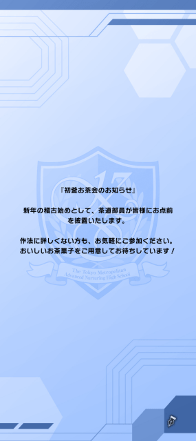 廊下の張り紙に、茶道部の初釜お茶会のお知らせがある。