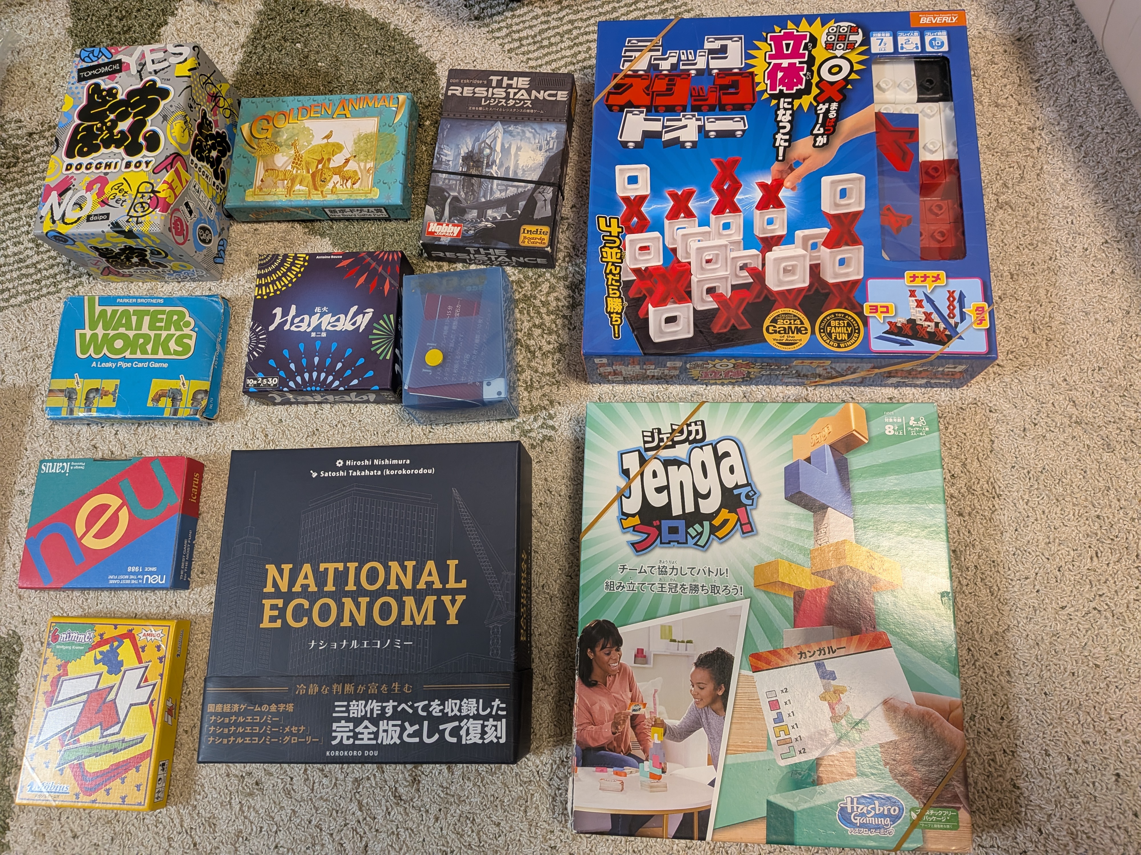 ただの日記。 健康・生活の話。 ボードゲームの話。 帰省するにあたってボードゲームを11点持っていった。 右のデカい2つは母方の実家へ置いていくボードゲーム。 ●ティックスタックトォー 立体マルバツ。四目並べ。 … 続きを読む 帰省して、ボードゲームやらビンゴ大会やら(ティックスタックトォー、NEU、ナショナルエコノミー、100円ショップのおもちゃが大人気)