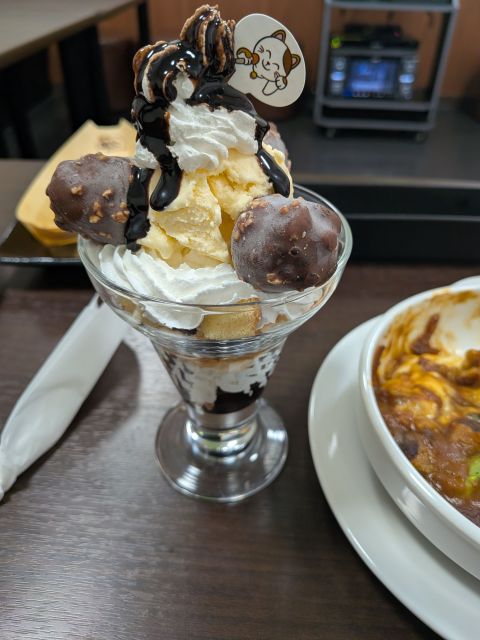 ワンドリンクのココア、カレーライス、揚げパン、パフェを注文し、合計金額が足りていないので、たこ焼きも注文する。