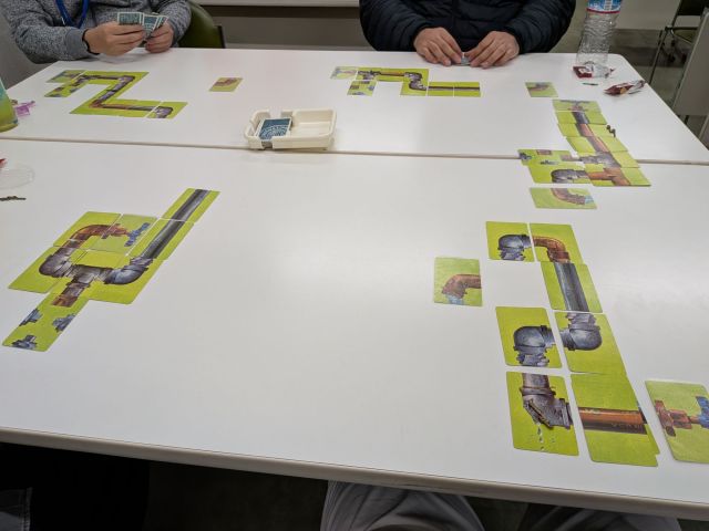 右下が私で、水漏れを直した上で、あと1枚あれば勝てる状況(8枚以上繋げて、最後に蛇口が正しく繋がれば勝ち)。