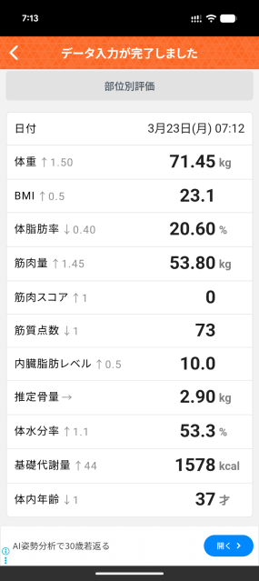 まあ体脂肪率は減っているし、BMIは23くらいなので良しとしておこう。