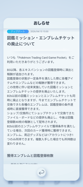 そういえば、図鑑ミッションとエンブレムチケットが廃止されるらしい。