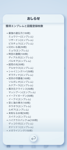 赤いギャラドスのミッションは難しすぎたので「空と海の導き」はエンブレム94枚で止まっていて、ルギアエンブレムが未入手(ホウオウエンブレムのみ入手)だからな。