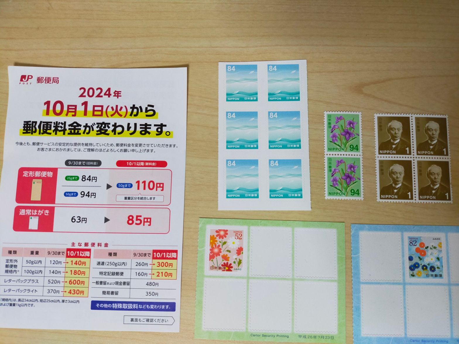 10/1から郵便料金が値上がりすると知る(ハガキ85円、封筒110円になる。52円や82円の切手が発掘された)。